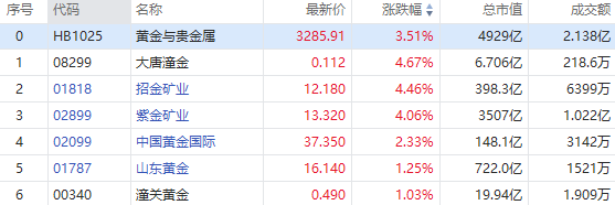 华盛资讯9月15日消息,港股黄金股延续涨势,截至发稿,大唐潼金涨近5%,紫金矿业、招金矿业涨超4%,中国黄金国际涨超2%,山东黄金涨超1%。