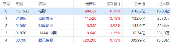 电影概念股早盘多数走高,猫眼娱乐、阿里影业涨近4%,IMAX中国涨超1%。