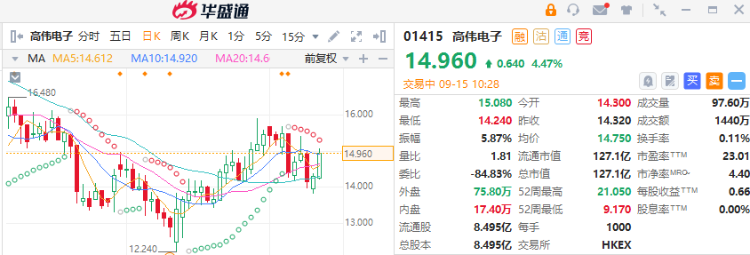 高伟电子(01415)涨近5%,截至发稿,涨4.47%,报14.96港元,成交额1440万港元。