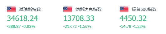 上周五美国三大股指全线收跌,道指跌0.83%报34618.24点,标普500指数跌1.22%报4450.32点,纳指跌1.56%报13708.34点。全周,道指涨0.12%,标普500指数跌0.16%,纳指跌0.39%。