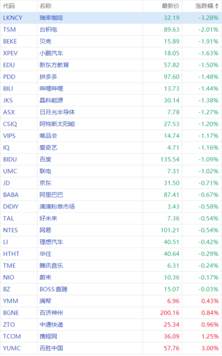 华盛资讯9月15日消息,热门中概股多数走弱,截至发稿,瑞幸咖啡跌超3%,台积电跌超2%,贝壳、小鹏汽车、拼多多、百度跌超1%,京东、阿里巴巴、滴滴、蔚来小幅走弱。