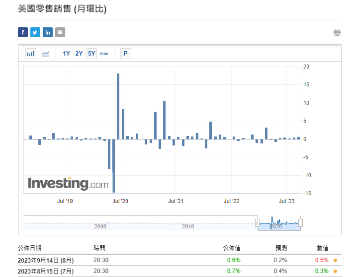 美国公布8月份消费者物价指数CPI按年升3.7%,高过预期3.6%及上月3.2%,连续两个月上升。按月升0.6%,符合预期,唯稍高上月0.2%。扣除食品及能源的核心CPI按年升4.3%,同符合预期,但略低过7月份4.7%。按月则升0.3%,同高过预期及上月0.2%。通胀数据略高预期,更持续上升。主要是国际原油价格急剧上升所引致。优于预期的数据,对下星期的议息结果已不能构成任何影响,预期利率将继续维持不变。但对 11月及12月的加息机会率则见小幅上升至超过4成。