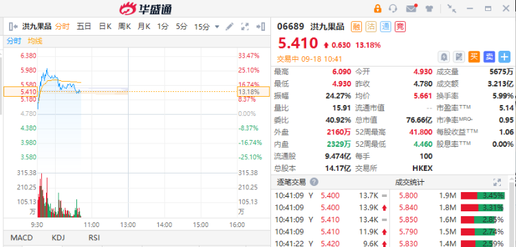 洪九果品(06689)早盘走强。截至发稿,涨13.18%,报5.41港元,成交额3.213亿港元。