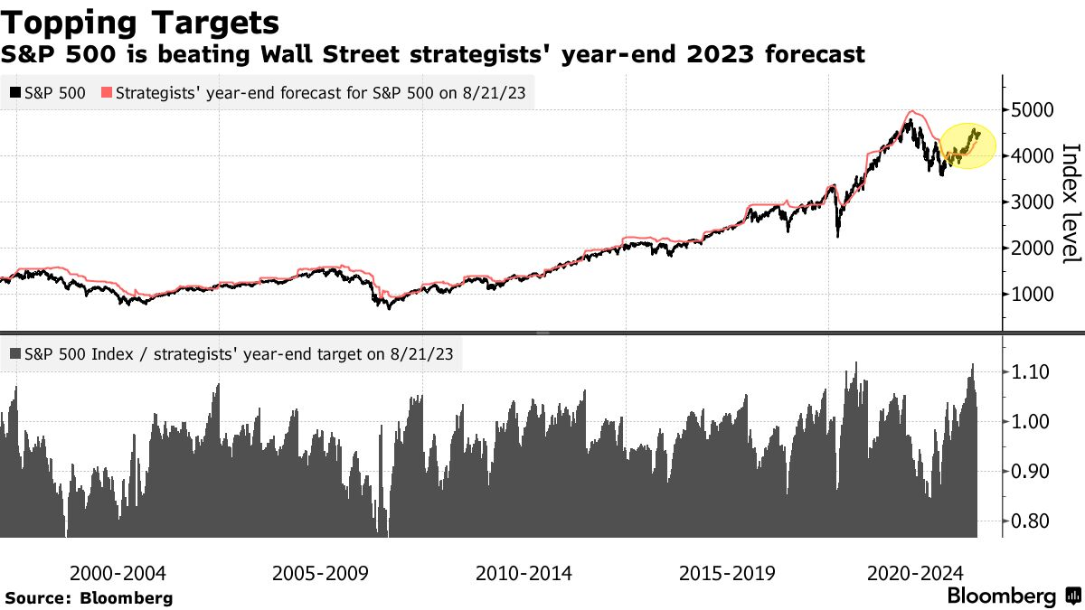 以法国兴业银行的Manish Kabra为例,他上周将该指数的年底目标从4300点提高到了4750点,比他原先预期的3800点高出了25%。Piper Sandler & Co.的Michael Kantrowitz和法国巴黎银行的Greg Boutle也曾是卖方预测者中目标最低的,分别为3225点和3400点。近几个月来,他们被迫上调了2023年的展望,以跟上今年15.9%的涨幅。