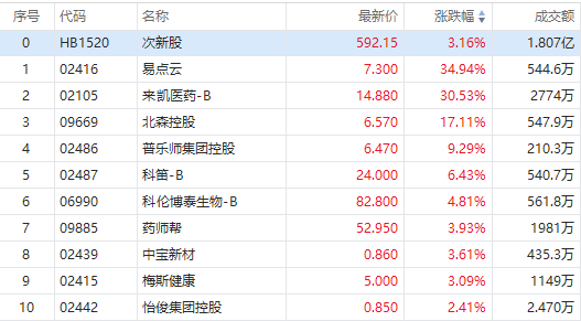 华盛资讯9月18日消息,港股次新股板块逆势走强,截至发稿,来凯医药-B涨超30%,易点云涨超34%,北森控股涨超17%,普乐师集团控股涨超9%,科笛-B涨超6%,科伦博泰生物-B涨超4%,药师帮涨超3%。