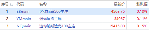 华盛资讯9月18日消息,三大股指期货盘前走高,截至发稿,纳指期货 $NQmain 现涨0.15%,标普500指数期货 $ESmain 涨0.13%,道指期货 $YMmain 涨0.11%。