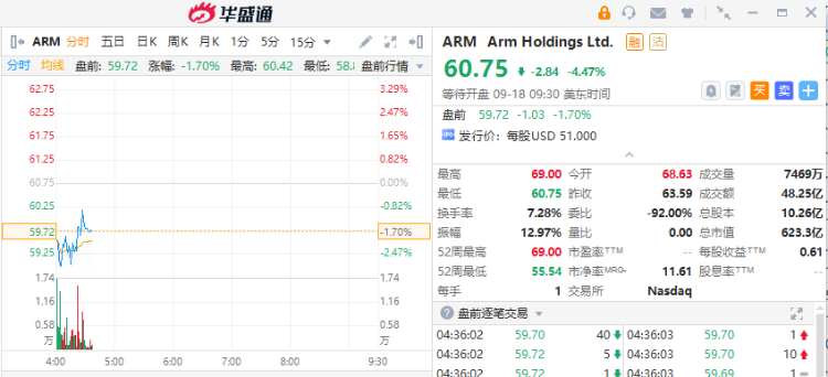 软银旗下芯片设计公司Arm $ARM 美股盘前跌1.70%。Arm上周四正式登陆纳斯达克,大幅收涨24.69%,收报63.59美元,总市值超650亿美元。