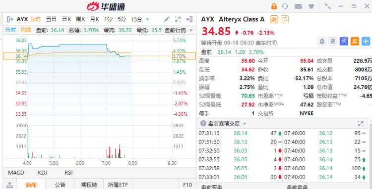 截至发稿,Alteryx( $AYX )盘前涨近4%,报36.24美元。消息面上,大摩上调Alteryx评级,由持股观望调整至增持评级, 目标价54.00美元。