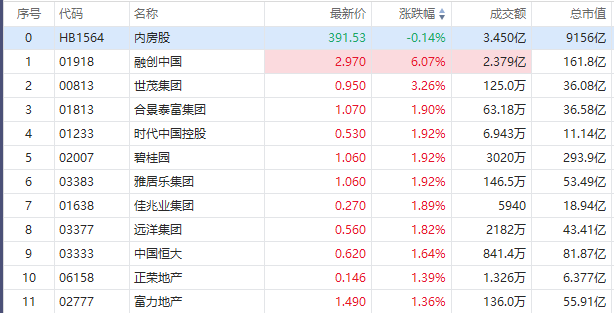 华盛资讯9月19日消息,港股内房股早盘走高,截至发稿,融创中国涨超6%,世贸集团涨超3%,合景泰富集团、时代中国控股、碧桂园、雅居乐集团、佳兆业集团涨超1%。