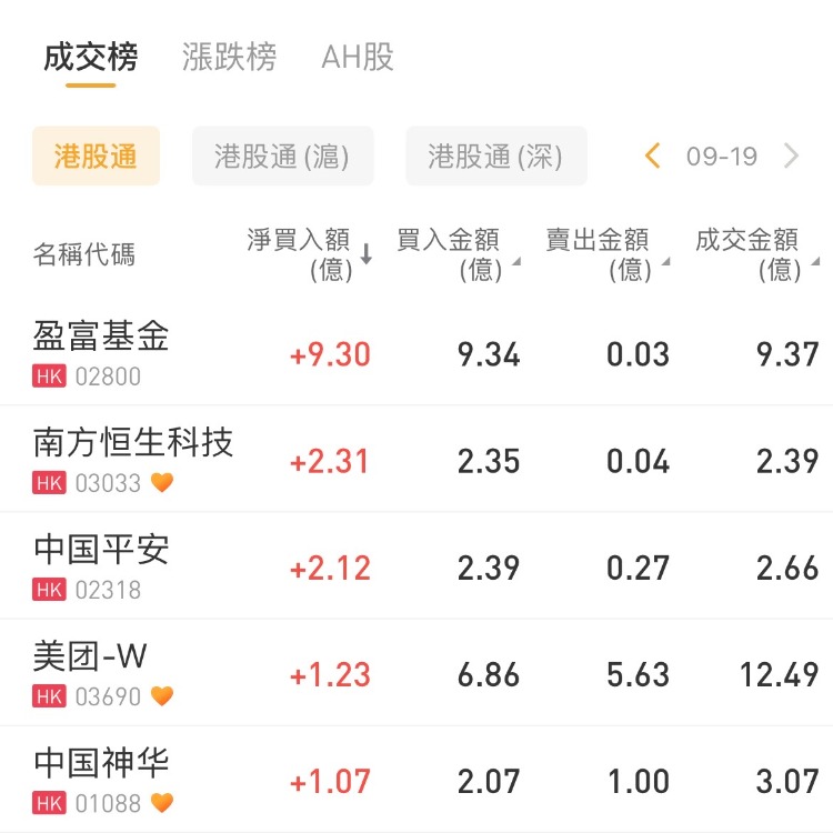 华盛资讯9月19日讯,南下资金今日净买入港股34.86亿港元,其中港股通(沪)净买入17.24亿港元,港股通(深)净买入17.63亿港元。