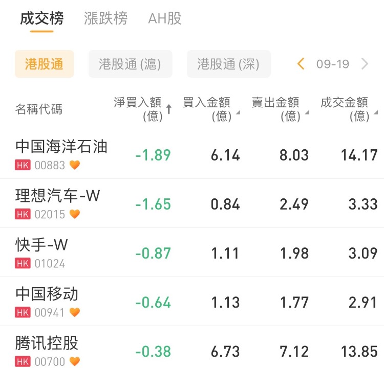 盈富基金、南方恒生科技、中国平安、美团-W分别获净买入9.3亿港元、2.31亿港元、2.12亿港元、1.23亿港元。中国海洋石油、理想汽车-W获净卖出1.89亿港元、1.65亿港元。
