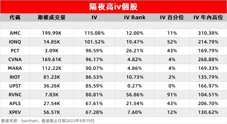 1、AMC院线 $AMC 收涨超5%,期权成交量近20万张,隐含波动率继续保持高位,且位于榜首。