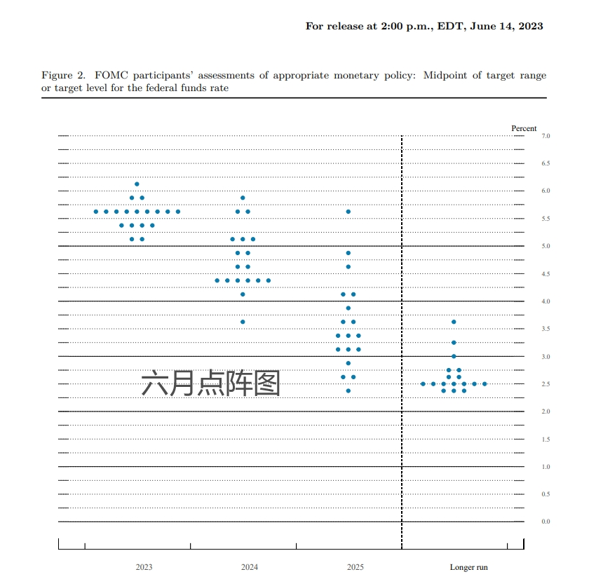 美联储点阵图显示,预计2023年年底的联邦基金利率为5.6%,预计2024年年底的联邦基金利率为5.1%。