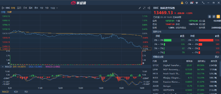 美联储主席鲍威尔也并未安抚市场,他表示,美联储准备在适当的情况下进一步加息,虽然强调将会“谨慎行事”。在鲍威尔讲话后,美股尾盘一路震荡走低,上演“跳水”,截至北京时间9月21日05:00,美股三大指数集体收跌。纳指下跌209点,跌幅1.53%,标普500指数跌0.94%,道指跌0.22%。