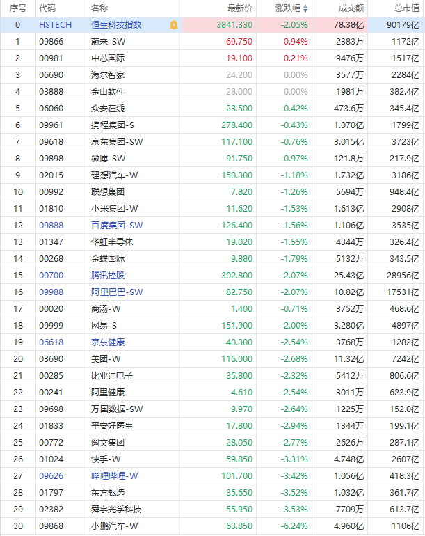 盘面上,科网股普跌,快手-W跌超3%;阿里巴巴-SW、腾讯控股、美团-W跌超2%;百度集团-SW、小米集团-W跌超1%;京东集团-SW、商汤-W跌近1%。