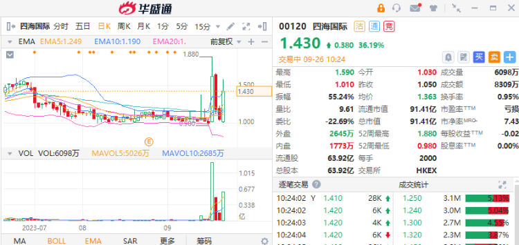9月26日讯,港股房企四海国际(00120)早盘一度暴涨50%,截至发稿涨幅缩窄至36%,现报价1.43港元。公司本月初获纳入港股通。