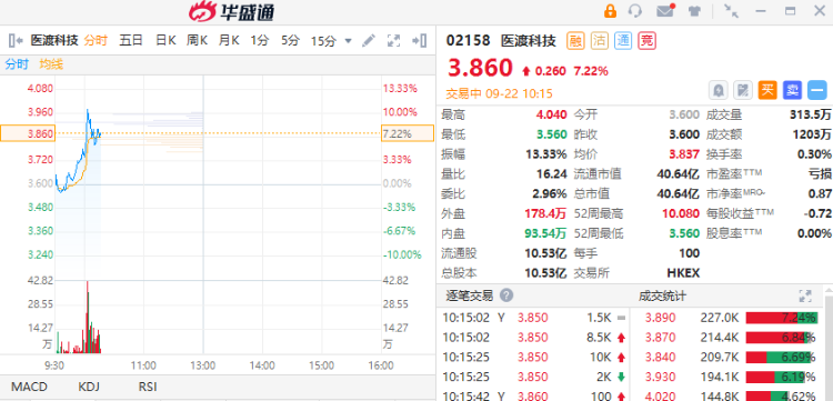 医渡科技早盘走强,截至发稿,涨7.22%,报3.86港元,成交额1203万港元。