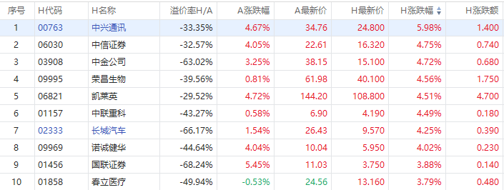 截至A股收盘,AH股涨幅前10如下: