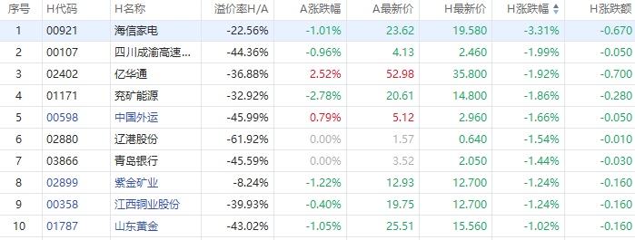 海信家电A股跌超1%,H股跌超3%;兖矿能源A股跌近3%,H股现跌近2%;紫金矿业A股跌超1%,H股跌超1%。
