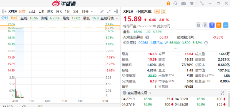 华盛资讯9月22日消息,三大股指期货盘前反弹。中概股盘前大涨,小鹏汽车涨超6%,阿里巴巴、理想汽车涨超4%,拼多多涨超3%,中国大盘股ETF $FXI 涨超4%。