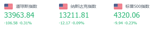 上周五美国三大股指全线收跌,道指跌0.31%报33963.84点,纳指跌0.09%报13211.81点,标普500跌0.23%报4320.06点。上周整周,道指跌1.89%,纳指跌3.62%,标普500跌2.93%。