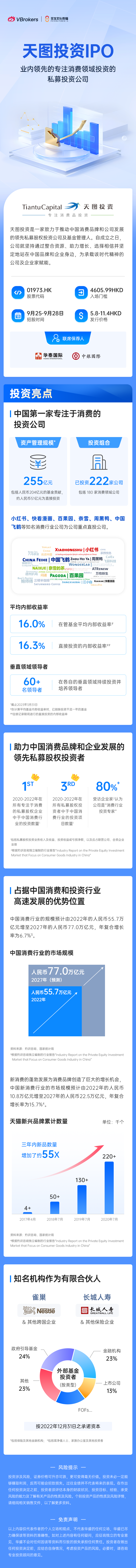 华盛资讯9月25日讯,天图投资于今日正式招股,一手入场费约4605.99港元,招股截止日为9月28日,华泰国际、中银国际为其联席保荐人,预期股份于10月6日正式挂牌港交所上市。前往申购>>