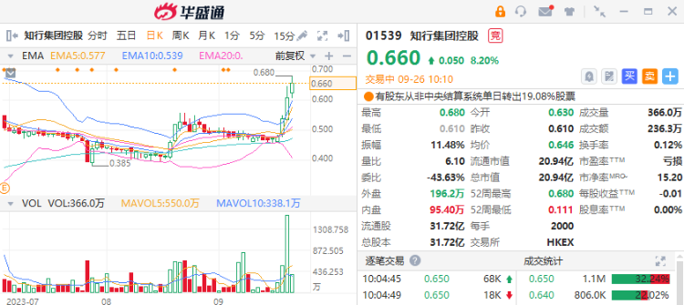 华盛资讯9月26日讯,港股知行集团控股早盘再涨8.20%,报0.66港元,成交额236.3万港元。公司股价已连续五个交易日上涨,累计涨幅超40%。