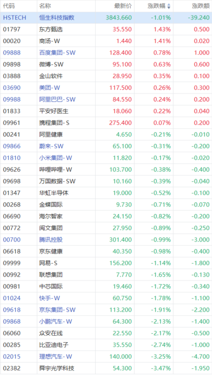 跌幅方面,舜宇光学科技、理想汽车跌超3%,比亚迪电子、众安在线、小鹏汽车跌超2%,京东、快手、中芯国际跌超1%,腾讯、小米、蔚来小幅走低。