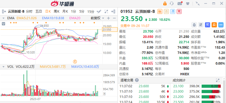 9月26日讯,云顶新耀-B(01952)再涨超10%,截至发稿,报23.55港元,成交额1.413亿港元。