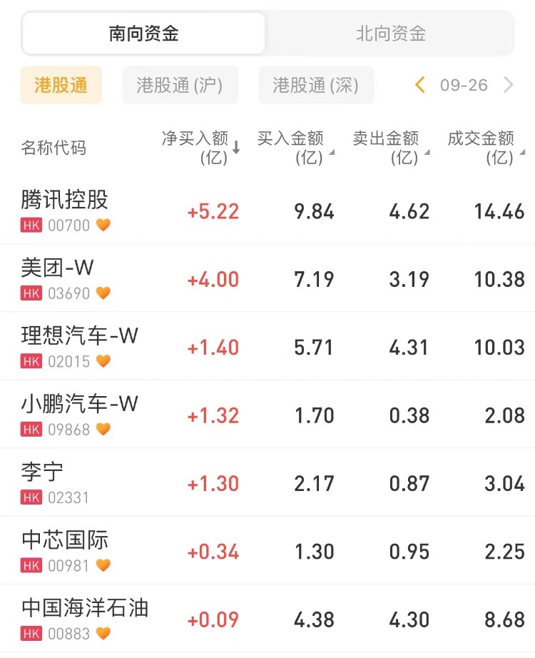 腾讯控股、美团-W、理想汽车-W分别获净买入5.22亿港元、4亿港元、1.40亿港元;盈富基金净卖出额居首,金额为16.21亿港元。