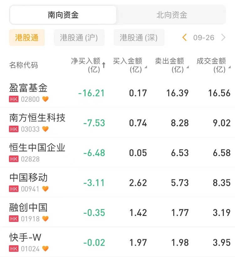 华盛资讯9月26日讯,南下资金今日净买入港股1.59亿港元,其中港股通(沪)净卖出2.98亿港元,港股通(深)净买入4.56亿港元。