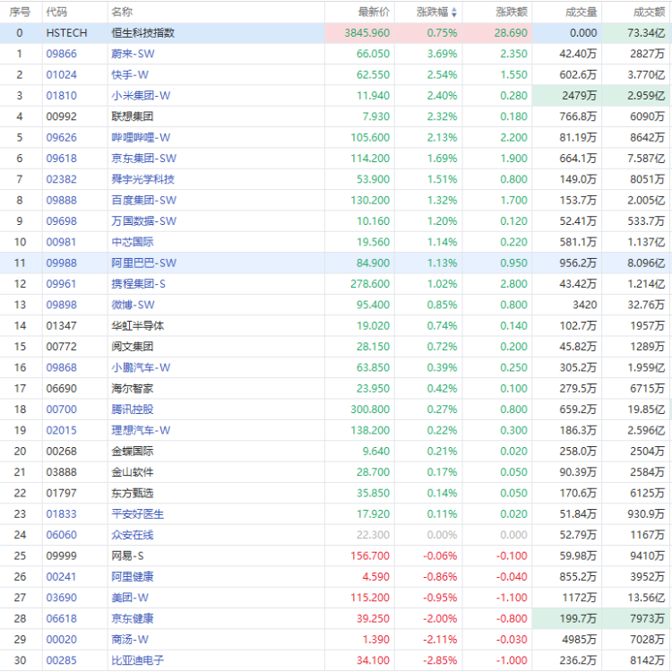 造车新势力回暖,蔚来-SW反弹超3%,小鹏汽车-W、理想汽车-W小幅走高;科网股多数反弹,快手-W、哔哩哔哩涨超2%,京东集团-SW、百度集团-SW、阿里巴巴-SW涨超1%。
