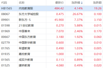 受上述消息影响,新东方-S $09901.HK 、21世纪教育 $01598.HK 、中国春来 $01969.HK 分别上涨7.37%、5.88%、2.46%。