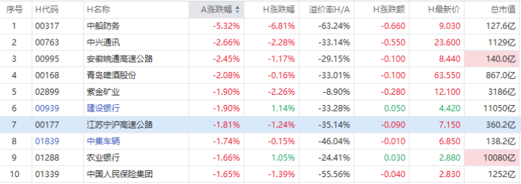 中船防务A股跌超5%,H股跌6.81%;中兴通讯A股跌2.66%,H股现跌2.28%;青岛啤酒股份A股跌超2%,H股微跌0.16%。