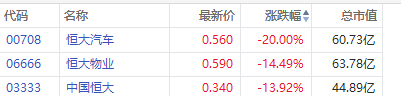 午后恒大系股票集体大幅走低,中国恒大跌14%,恒大汽车暴跌20%,恒大物业跌逾14%。值得注意的是,早间中国恒大股价一度涨逾10%,午后随着相关消息的持续发酵,恒大系股票大幅走低。