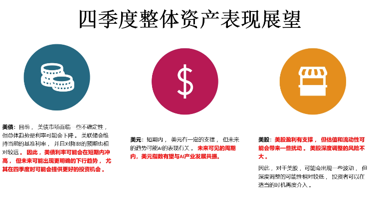 展望四季度,美国CPI将会回落,短期内美债利率可能仍维持高位,因此市场仍会有一些颠簸,并持续到明年二季度,而随着美联储宣布具体降息计划,医药、科技、AI软服板块将迎来更好的配置时机。
