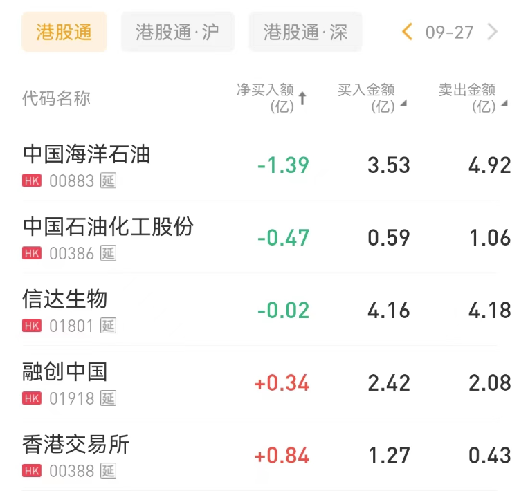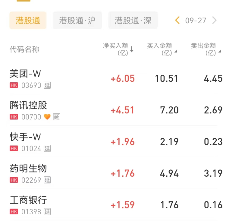 美团-W、腾讯控股、快手-W分别获净买入6.05亿港元、4.51亿港元、1.96亿港元;中国海洋石油净卖出额居首,金额为1.39亿港元。