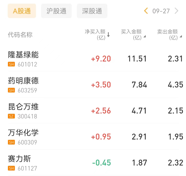 北向资金今日净买入18.03亿元。隆基绿能、药明康德、昆仑万维分别获净买入9.2亿元、3.5亿元、2.56亿元。宁德时代净卖出额居首,金额为3.4亿元。