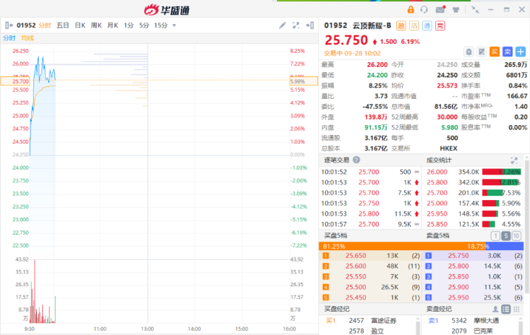 云顶新耀-B $01952.HK 盘初涨超7%,高见26.2港元创今年2月份以来新高。截至发稿,涨6.19%,报25.75港元,成交额6801万港元。