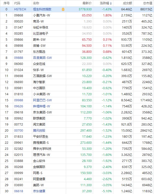 科网股多数走低,美团-W、网易-S跌超3%;京东集团-SW、阿里巴巴-SW、哔哩哔哩-W、腾讯控股跌超1%;百度集团-SW、快手-W小幅下跌。
