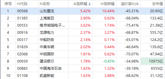 截至A股收盘,AH股涨幅前10如下: