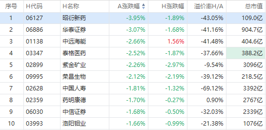 截至A股收盘,AH股跌幅幅前10如下: