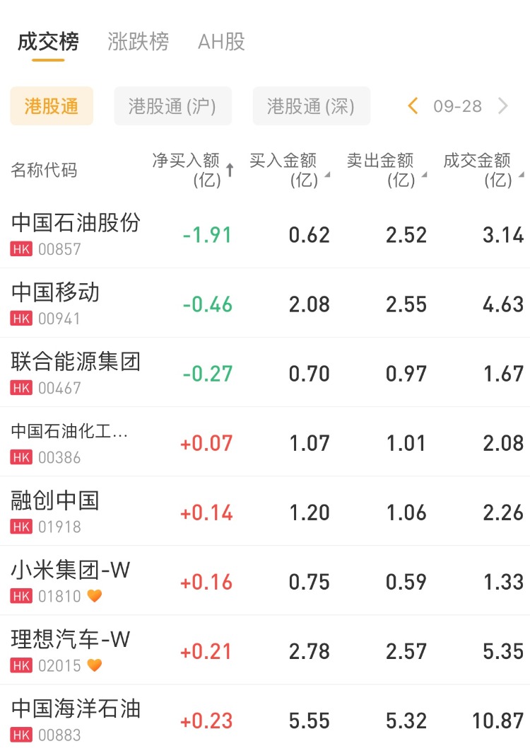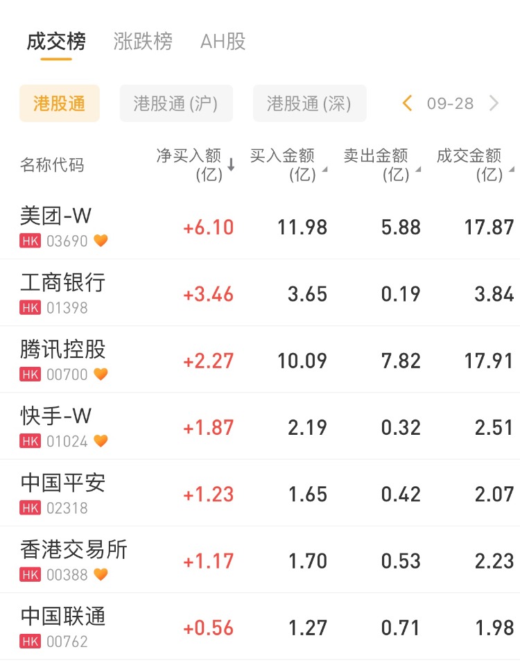 美团-W、工商银行、腾讯控股分别获净买入6.10亿港元、3.46亿港元、2.27亿港元;中国石油股份净卖出额居首,金额为1.91亿港元。