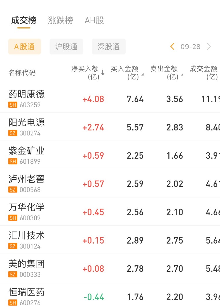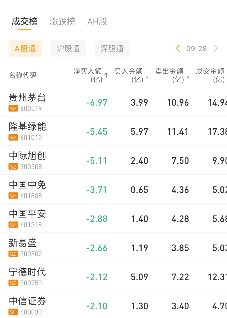 北向资金今日净卖出49.95亿元。药明康德、阳光电源、紫金矿业分别获净买入4.08亿元、2.74亿元、0.59亿元。贵州茅台净卖出额居首,金额为6.97亿元。
