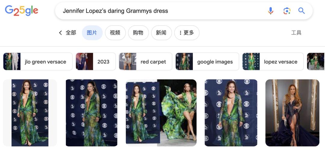 当詹妮弗·洛佩兹在2000年格莱美颁奖典礼上穿着一款惊艳的范思哲裙子后,这个时装瞬时成为传奇,也成为当时谷歌最热门的搜索词。当时,搜索结果只是一列蓝色链接,人们无法轻易找到想要的图片。这启发我们创建了谷歌图片。