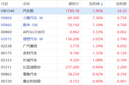隔夜美股汽车股走高,港股汽车产业链早盘回暖。截至发稿,小鹏汽车、蔚来涨超7%;理想汽车涨超3%,广汽集团、吉利汽车、长城汽车涨超1%,比亚迪股份小幅上涨。