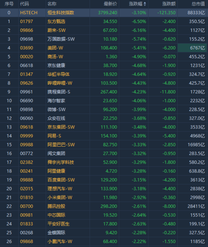 盘面上,东方甄选跌超6%,万国数据-SW跌近6%,携程集团-S跌超4%,众安在线、阅文集团、舜宇光学科技跌超3%。