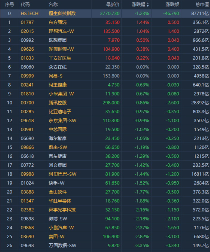 科网股走低,百度集团-SW跌近4%,商汤-W跌超3%,美团-W跌近3%,快手-W、阿里巴巴-SW跌超1%,腾讯控股、京东集团-SW等跌近1%。