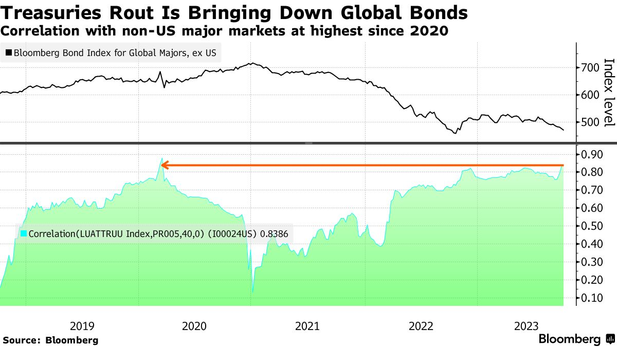 数据显示,追踪全球主要债券(不含美国)的指数与美国国债指数之间的相关性已达到2020年3月以来的最高水平。