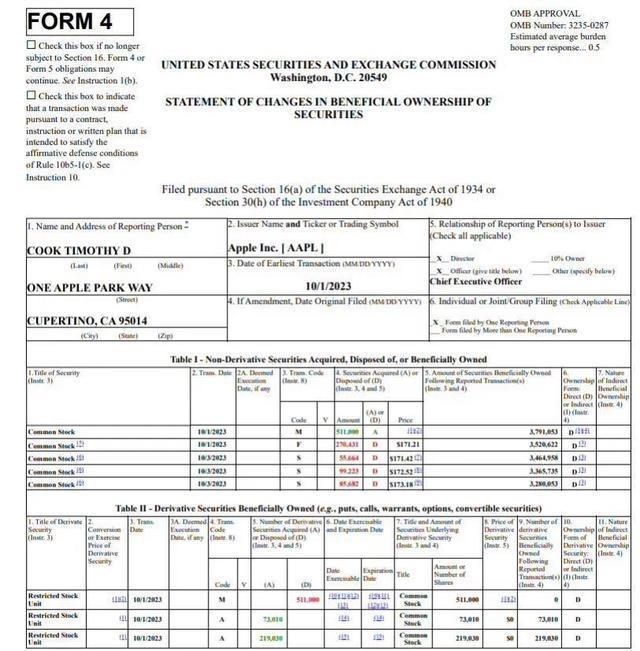 SEC文件显示,库克以每股171美元至173美元的价格出售51.1万股苹果公司股票,出售后仍持有约328万股。高级执行副总裁奥布莱恩(Deidre O 'Brien)和亚当斯(Katherine Adams)跟随库克步伐一起出售了价值约1130万美元的股票。库克将今年薪酬削减约40%至4900万美元,并将与业绩挂钩的股票奖励将从之前的50%增加至75%。
